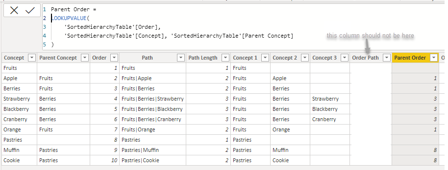 Order 1 = LOOKUPVALUE ( SortedHierarchyTable[Order], SortedHierarchyTable[Concept], SortedHierarchyTable[Concept 1] )