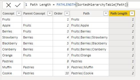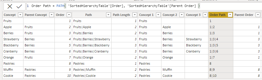 Order Path = PATH ( 'SortedHierarchyTable'[Order], 'SortedHierarchyTable'[Parent Order] )![]()
