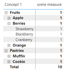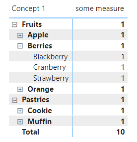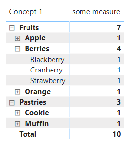 some measure = VAR currentItem = SWITCH ( TRUE (), ISINSCOPE ( 'SortedHierarchyTable'[Concept 3] ) && NOT ISBLANK ( SELECTEDVALUE ( 'SortedHierarchyTable'[Concept 3] ) ), SELECTEDVALUE ( 'SortedHierarchyTable'[Concept 3] ), ISINSCOPE ( 'SortedHierarchyTable'[Concept 2] ) && NOT ISBLANK ( SELECTEDVALUE ( 'SortedHierarchyTable'[Concept 2] ) ), SELECTEDVALUE ( 'SortedHierarchyTable'[Concept 2] ), ISINSCOPE ( 'SortedHierarchyTable'[Concept 1] ) && NOT ISBLANK ( SELECTEDVALUE ( 'SortedHierarchyTable'[Concept 1] ) ), SELECTEDVALUE ( 'SortedHierarchyTable'[Concept 1] ), "TOTAL" ) VAR currentItemValue = IF ( currentItem = "TOTAL", COUNTROWS ( 'SortedHierarchyTable' ), CALCULATE ( COUNTROWS ( 'SortedHierarchyTable' ), 'SortedHierarchyTable'[Concept] = currentItem ) ) VAR result = SWITCH ( TRUE (), ISINSCOPE ( 'SortedHierarchyTable'[Concept 3] ) && ISBLANK ( SELECTEDVALUE ( 'SortedHierarchyTable'[Concept 3] ) ), BLANK (), ISINSCOPE ( 'SortedHierarchyTable'[Concept 2] ) && ISBLANK ( SELECTEDVALUE ( 'SortedHierarchyTable'[Concept 2] ) ), BLANK (), currentItemValue ) RETURN result