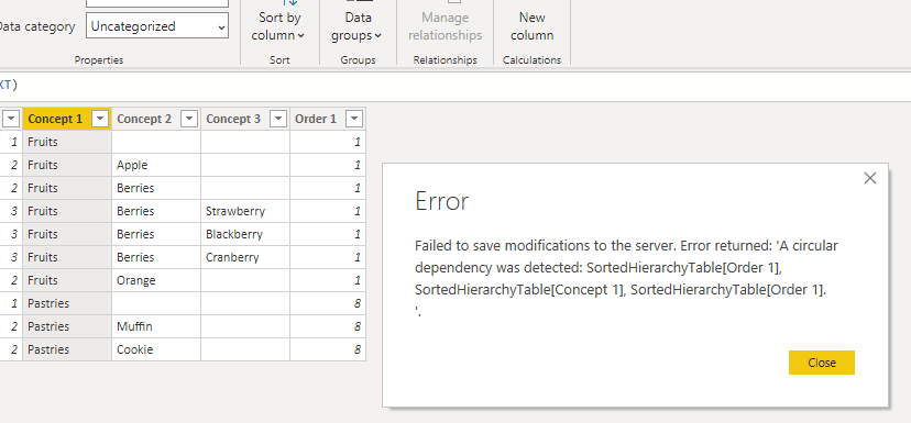 What the French Toast would Patrick say. I did manage to sort it if I connected my report table to a copy of it using Concept 1 item, but that was way too bad, as I would need 3 calculated tables just to sort a hierarchy?!?