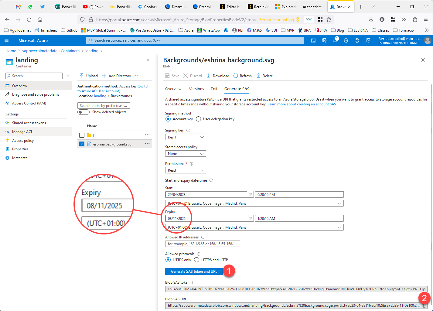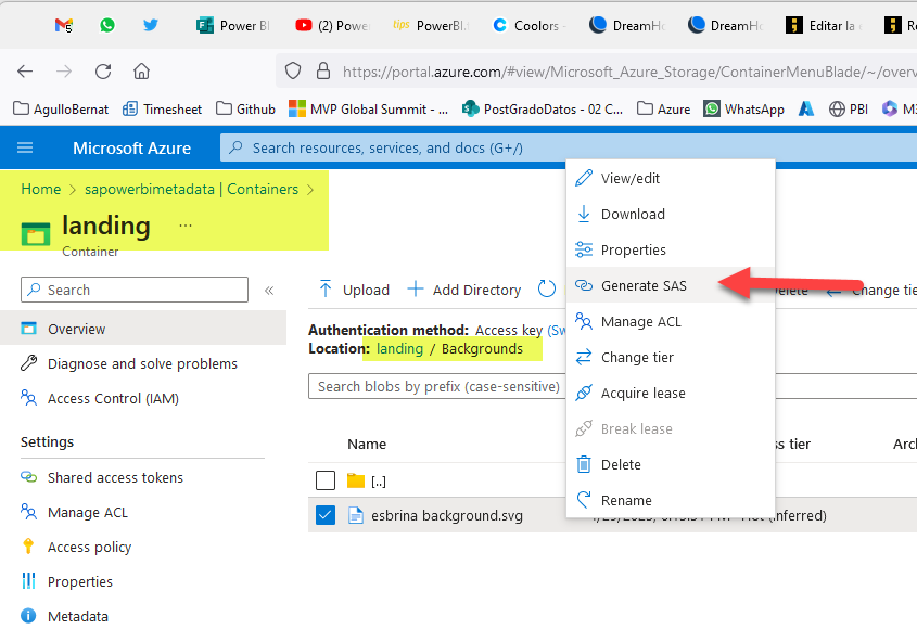 Now to get that secure URL I don’t think it can be done from here, so we need to go into the Azure Portal and look for the same file there. Once you find it right click on it and select «Generate SAS» (yes, trust me!) Aparently SAS stands for «Shared Access Signature»
