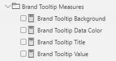 To complete the tooltips I created 3 groups of measures, one for each Tooltip Type (Brand, ProductCategoryName, and Year). And, as we said before, in each group there are 4 measures: one for Values, one for Background color, one for Title and one for Data Colors.