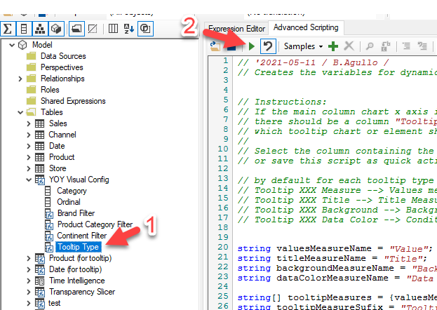 - Now, on the model tree in tabular editor, select the Tooltip Type column and run the script