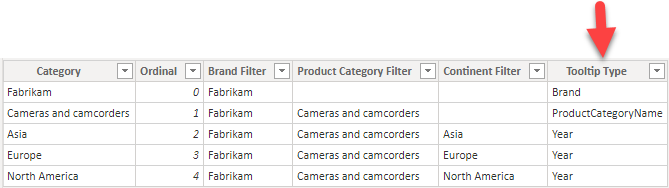And so on. However, on a general case, we might have a few columns that share the same tooltip, just displaying different data, just as we saw on the example above for «Asia», «Europe» and «North America». It does not really make sense to check all the individual categories, for something that we can put on the same «KPI Chart» Table. Adding a «Tooltip Type» column makes things much clearer.