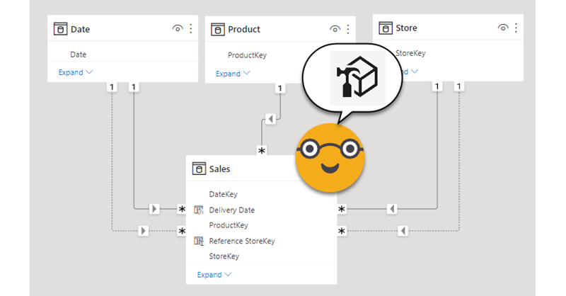Hi, today I want to talk about inactive relationships. Those relationships with the dashed line that unless you invoque them with USERELATIONSHIP they do nothing. The thing is a common pattern if you read this blog — let’s say you have a retail model, and for some charts you need to use the order date and in other charts the delivery date. Other than that measures are the same, such as Sales amount, total cost, margin etc. Well, you could do a copy of each of the measures and wrap it in a CALCULATE( … USERELATIONSHIP(… ) ) or do a calculation group. Today we’ll do that, with style.