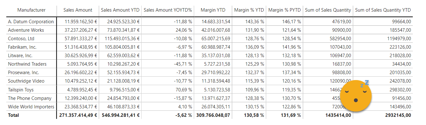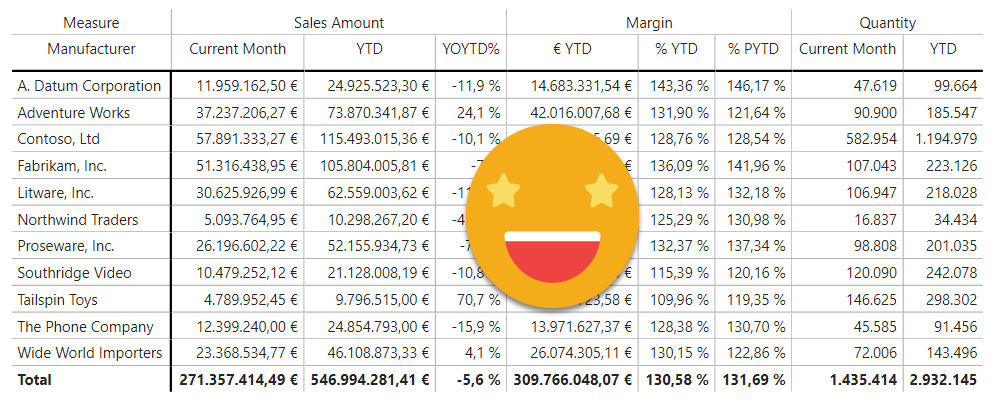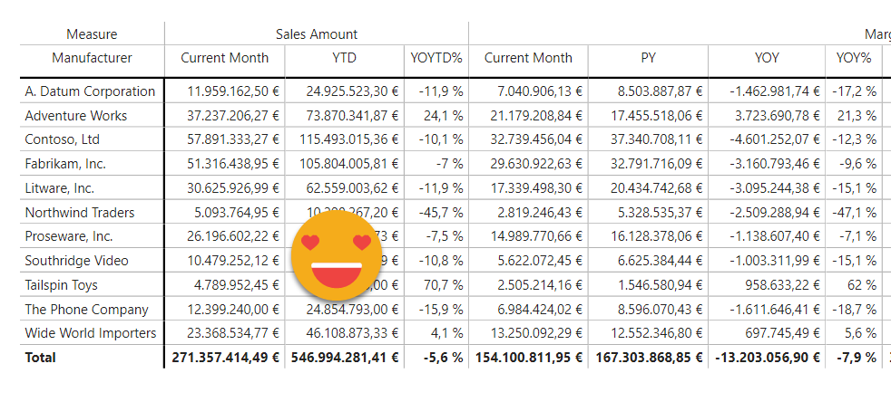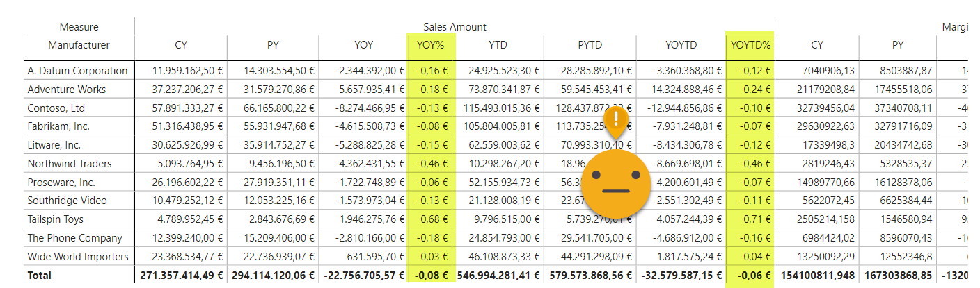 Margin group (format string) = IF ( ISSELECTEDMEASURE ( [Dynamic Measure] ), VAR selectedCalculation = SELECTEDVALUE ( 'Time Intelligence'[Time Intelligence] ) RETURN SWITCH ( TRUE (), selectedCalculation IN ( { "€ YTD" } ), "#,0.00\ ""€"";-#,0.00\ ""€"";#,0.00\ ""€""", selectedCalculation IN ( { "% YTD", "% PYTD" } ), "#,##0.00 %" ), SELECTEDMEASUREFORMATSTRING () )