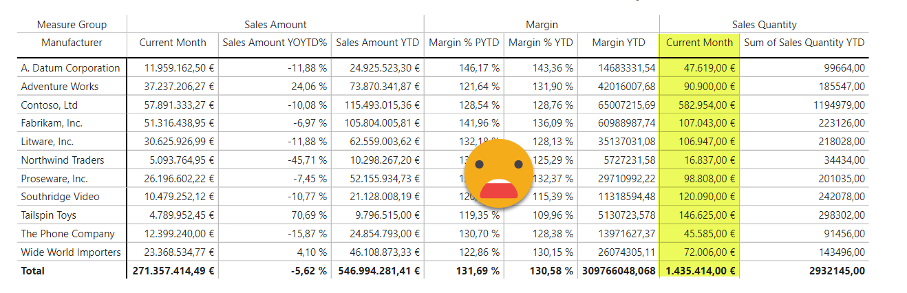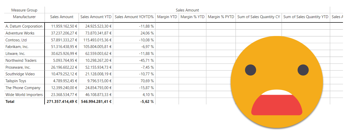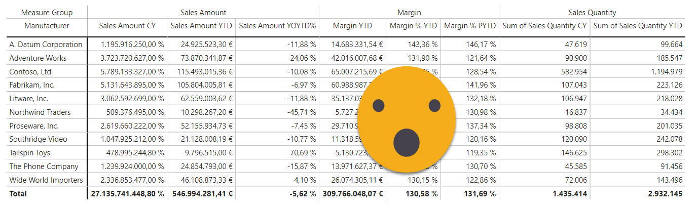 So what is to be done? Of course, «group» the measures in calculation items that will blank out any other measures. At this point is important to think big. Can you be 100% sure that you (or your customer) will not want to add an extra column in the matrix? Now that they’ll get decent horizontal scrolling of headers they might throw in a few more, I’m sure. So the answer is «No, i’m not 100% sure this is the final set of columns. However! you can be 99,9% sure of all the candidates that will go to the Sales Amount group, Margin Group and Sales Quantity Group, right? Then put all the potential columns in each group — remember that only the measures that you add to the visual can be shown anyway (that’s an even more basic rule to remember).