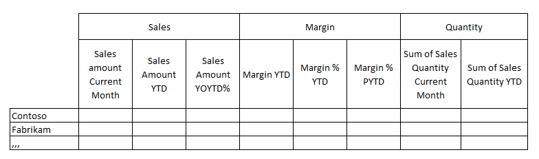 As we see we need some base measures Sales Amount, Margin, Margin %, Sum of Sales Quantity, and some standard time calculations. The measures are very straight forward