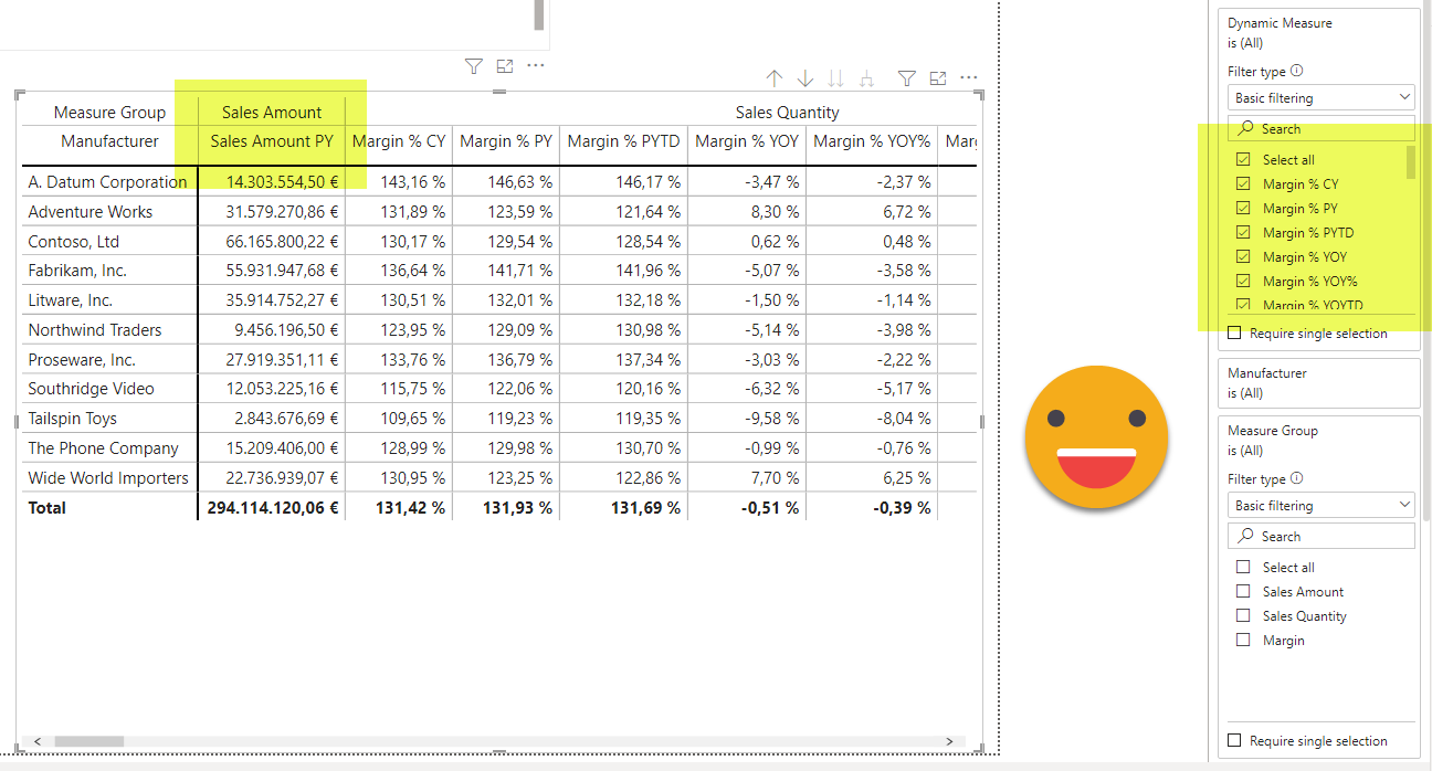 Margin group (value) = IF ( ISSELECTEDMEASURE ( [Dynamic Measure] ), VAR selectedCalculation = SELECTEDVALUE ( 'Time Intelligence'[Time Intelligence] ) RETURN SWITCH ( TRUE (), selectedCalculation IN ( { "€ YTD" } ), [Margin], selectedCalculation IN ( { "% YTD", "% PYTD" } ), [Margin %] ), SELECTEDMEASURE () )