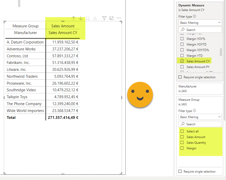 Once you see it, it’s quite obvious, isn’t it? Well, it turns out this approach does work, because there’s only and measure, and all the logic works on the actual measure placed in the visual. Putting the Measure group calc group column without any filters, and the Sales Amount CY calc item of they dynamic measure calc group, shows only one column (and not three!). And it shows where it belongs!