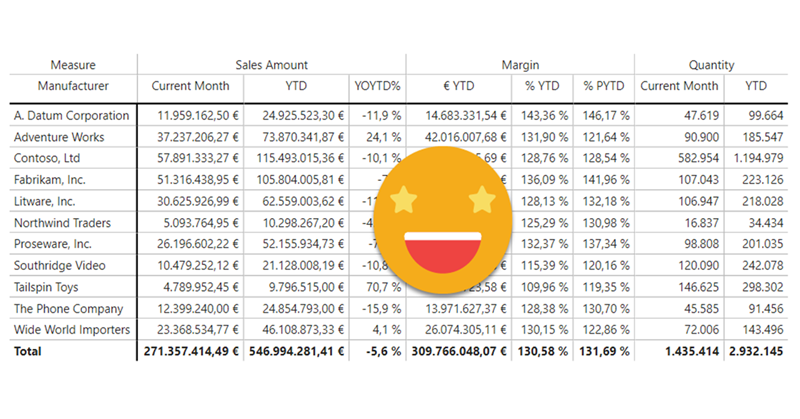 If you have worked with Matrix visual you probably have faced the problem: Your end user would like to group all the measures that are thrown in into neat little groups, putting all de Quantity- related measures in one group, all the value measures in another, for example. What I’ve seen so far is that people just struggle with the fact that this is not possible in the Matrix visual, and add text boxes on top, as if the header was indeed a two-row header. But it’s not. And if you have a large matrix that requires horizontal scroll, you’ll know what I am talking about. Can we do any better? Yes. Are calculation groups involved? You bet. Difficult DAX? Not at all!