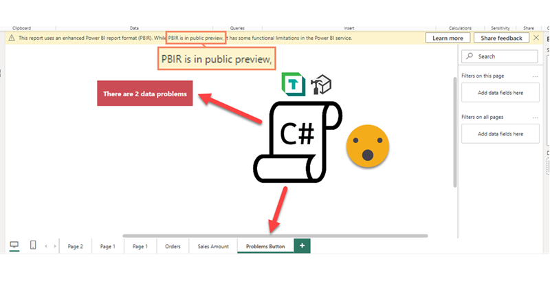 I thought it would be fun to develop some script that created something on the report layer. Something that I may do more than once and that is boring to build because it’s always the same. And it came to my mind that one such candidate would be the «data problems button» that I was mentioning at the beginning. As I did not want to break anything I decided that my first iteration would add a new page to the target report and add the button already configured with all the measures required, and any extra formatting.