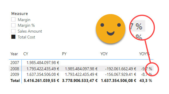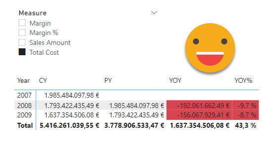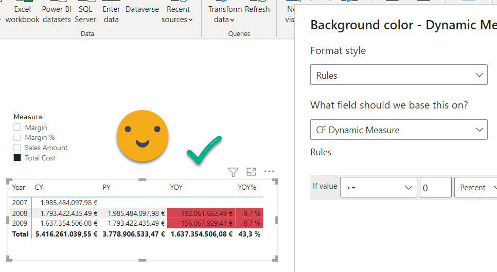 However, if you want something more fancy, it’s time to think. For instance, how can we make conditional format to apply only on the YOY% ? We can’t add this sort of logic in the conditional format dialog panel. But can we add this logic with a measure? Actually not really. It is true we need the value driving format to follow the value of the dynamic measure, but if we create a new measure affected by the dynamic measure calc group, whatever its contents, it will be completely replaced by the measure selected in the measure slicer.