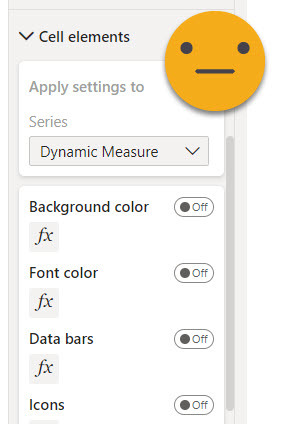 Well, first thing, since we are using just one measure (our dynamic measure), we don’t get to say (directly) on which «column» we want to apply conditional format (which by the way now you’ll find in «Cell Elements» section)