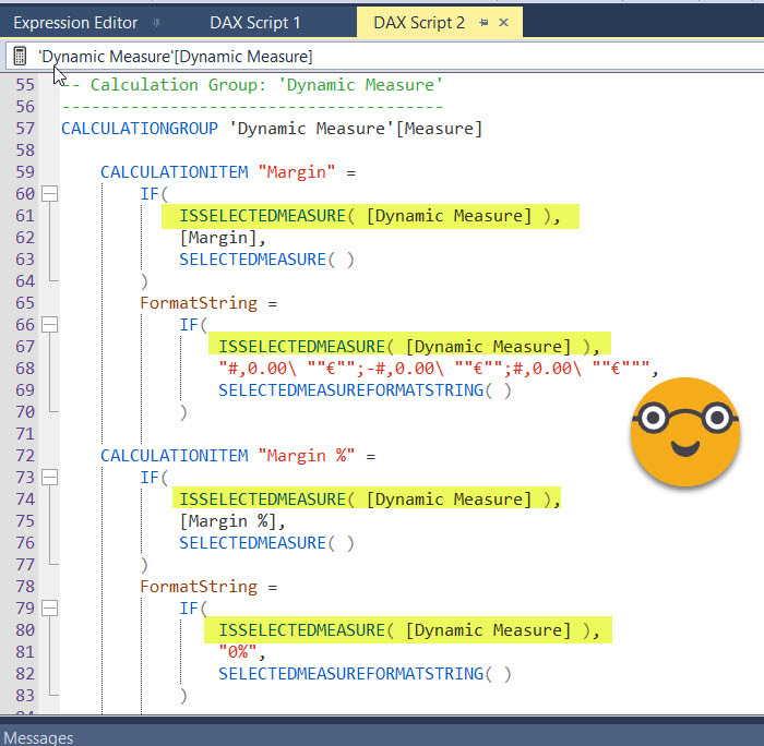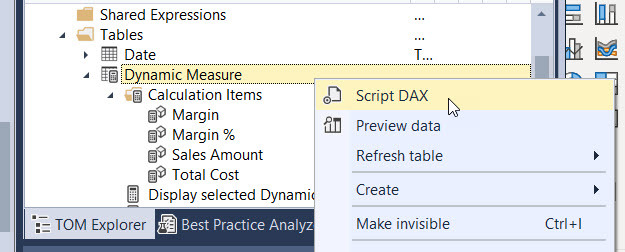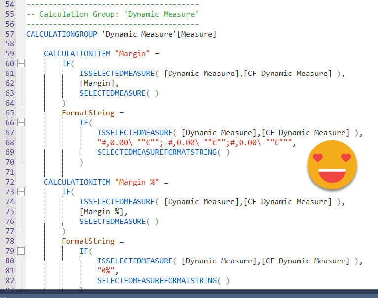 Now, if you are familiar with the calculation group created by the time intelligence calc group script, you’ll know it creates a calculated table with the list of measures it affects, so adding one is no big deal, just change the table definition and it works on the new measure, for all calc items –value *and* format expression. The dynamic measure calc group is not build like this because by default it only replaces 1 measure, the «dynamic measure» placeholder one. In this example we have only 4 measures, so we could just go and change it manually (that’s 8 places between value and format string expressions) but we can also show how to use a really cool feature from Tabular Editor 3, which is DAX scripting (no, it’s not C# scripting, that’s something else entirely). Since version 3.1.5 we can script out calculation groups so we see all calculation items at the same time. Then we can do any modifications, execute and all changes can be saved back to the model in one click. Sweet, huh? To be honest I don’t use them that much, but today is the day.