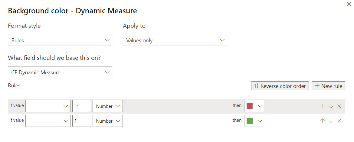 So following a pretty standard rule, we’ll format good things green and bad things red. To do that we’ll make the dax code produce a 1 for good things and -1 for bad things. Then on the conditional format pane we’ll assign the green to the 1 and red to the -1.