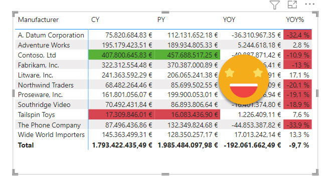 CY PY YOY% = SWITCH ( TRUE (), SELECTEDMEASURENAME () IN { "CF Dynamic Measure" }, VAR currenTimeIntelCalcItem = SELECTEDVALUE ( 'Time Intelligence'[Time Intelligence] ) RETURN SWITCH ( TRUE (), currenTimeIntelCalcItem IN { "YOY%" }, IF ( SELECTEDMEASURE () < 0, -1 ), currenTimeIntelCalcItem IN { "CY", "PY" }, VAR currentValue = SELECTEDMEASURE () VAR maxValue = CALCULATE ( MAXX ( VALUES ( 'Product'[Manufacturer] ), SELECTEDMEASURE () ), REMOVEFILTERS ( 'Product'[Manufacturer] ) ) VAR minValue = CALCULATE ( MINX ( VALUES ( 'Product'[Manufacturer] ), SELECTEDMEASURE () ), REMOVEFILTERS ( 'Product'[Manufacturer] ) ) RETURN SWITCH ( TRUE (), currentValue = maxValue, 1, currentValue = minValue, -1, BLANK () ), BLANK () ), SELECTEDMEASURE () )