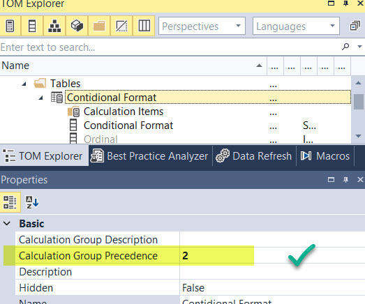 Let’s create a calc group (no script this time) as «Conditional Format» for instance. New Calc groups are always created with higher precedence, but check the number just in case. It should be 2. (0 for Dynamic Measure, 1 for Time Intelligence).