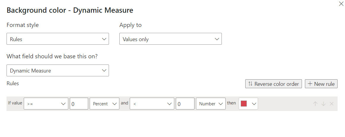 In order to to something like this we’ll have to move the logic we had in the conditional formatting pane into the dax code. But since it’s more convenient to select colors from the color picker than to go back and forth with HEX codes, we’ll stick with the Rules option, we’ll just encode each outcome to a number, and we’ll use the pane to assign colors to each number.