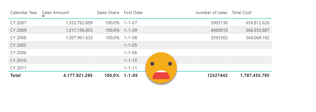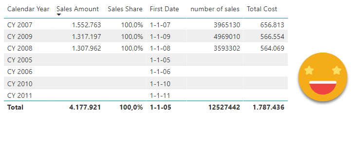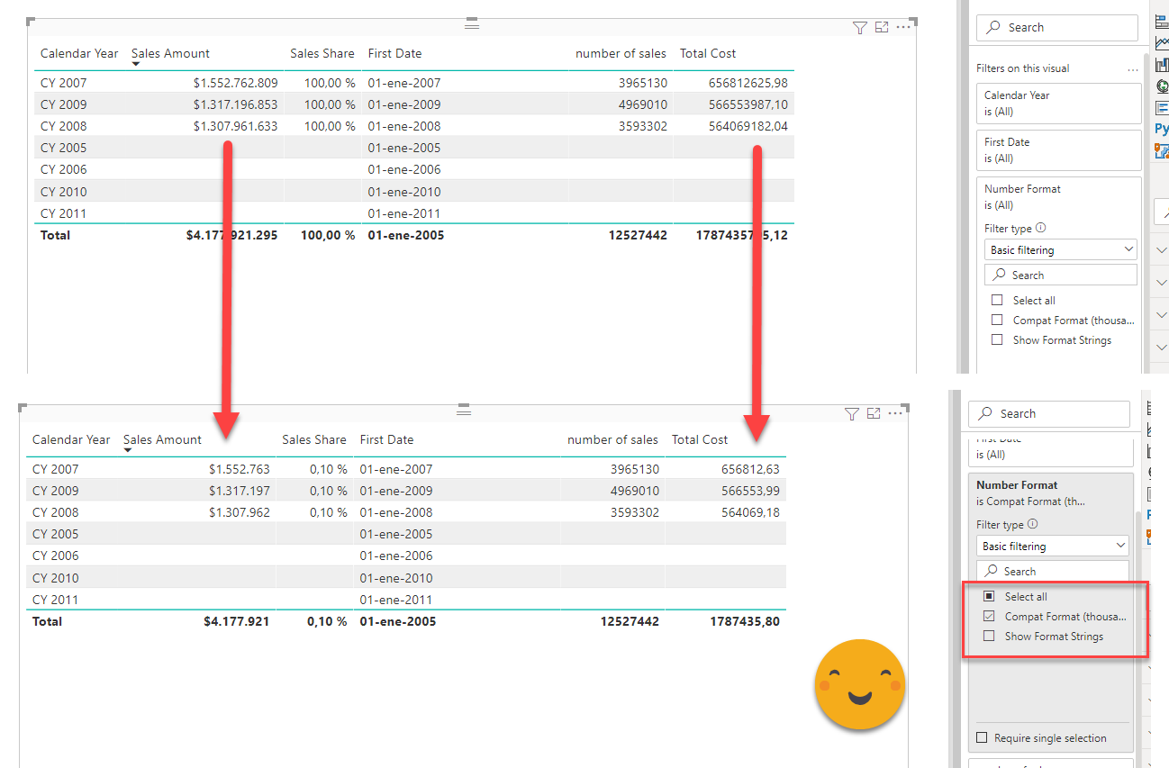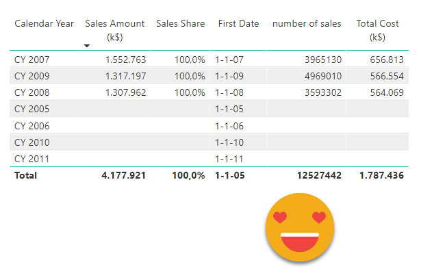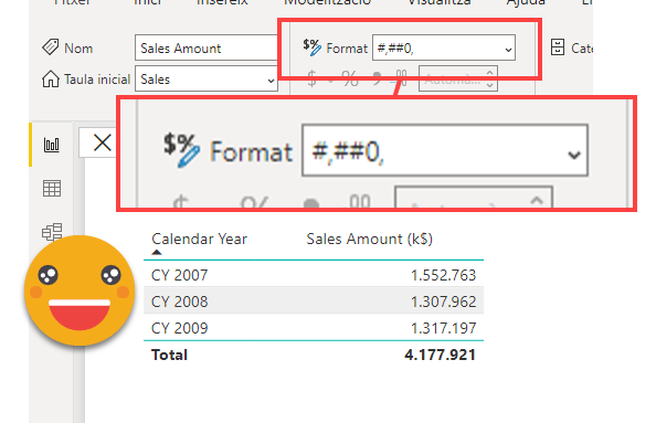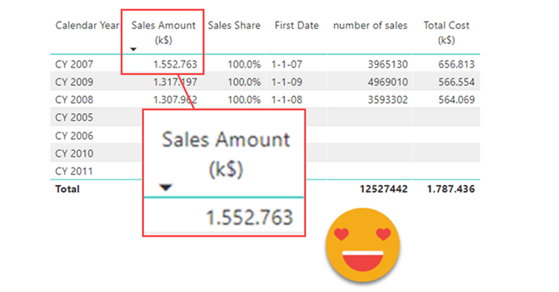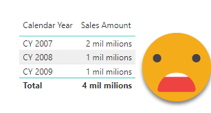 We can do all sorts of things, and maybe make a dynamic format that depending on the maximum value shown on the table establishes the display units (as it can change with the filters), but that might make things more confusing. As it is now is something easy to understand and that will avoid writing pointless measures just to show values as thousands without any suffix. Thank you for reading all the way to the end.