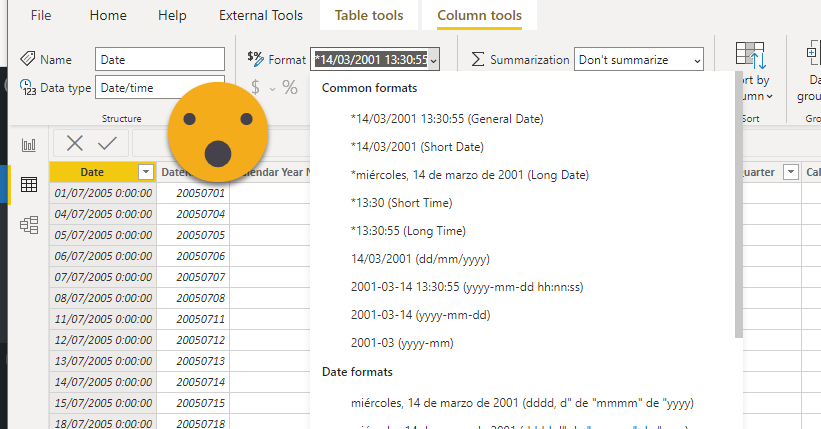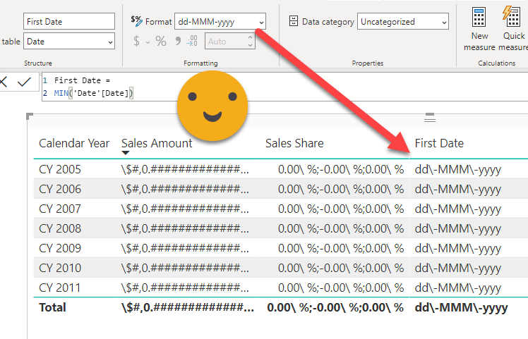 I guess the approach is to set the column format and the measures will take it from there — but still, it would be nice if they added some default date formats. End of rant.