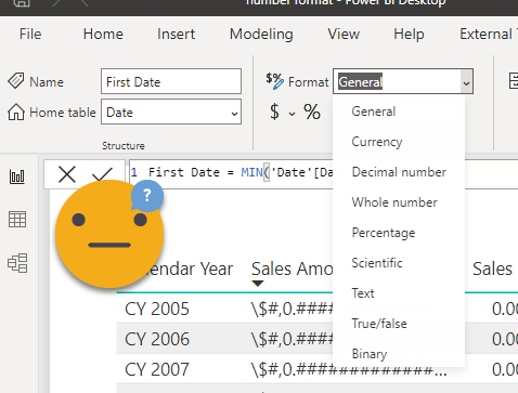 However in Power BI the same magic does not happen. You can type in the format string (don’t be fooled by the dropdown, you can actually type format strings there), but it just does nothing.