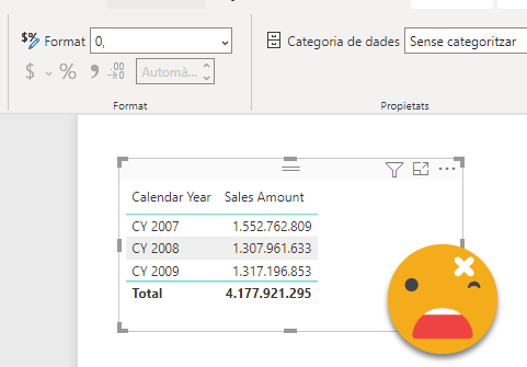 «Fear not», you will say, Power BI has this use case on it’s ‘done’ list and you can choose the display units from the format pane. Well. Maybe. But it’s so rigid. I mean, if you don’t like whatever word or letter it shows for the unit, you’re stuck. You can’t change the display units without a suffix. And if you configure power bi in catalan (who doesn’t? — just kidding, I use the English version), the «abbreviation» for (american) billions is something like