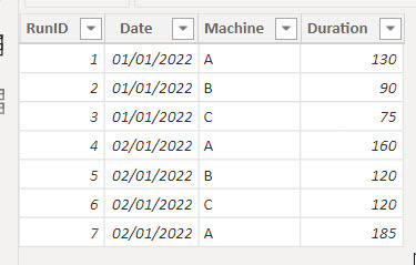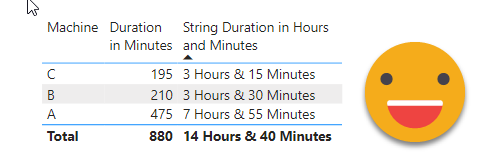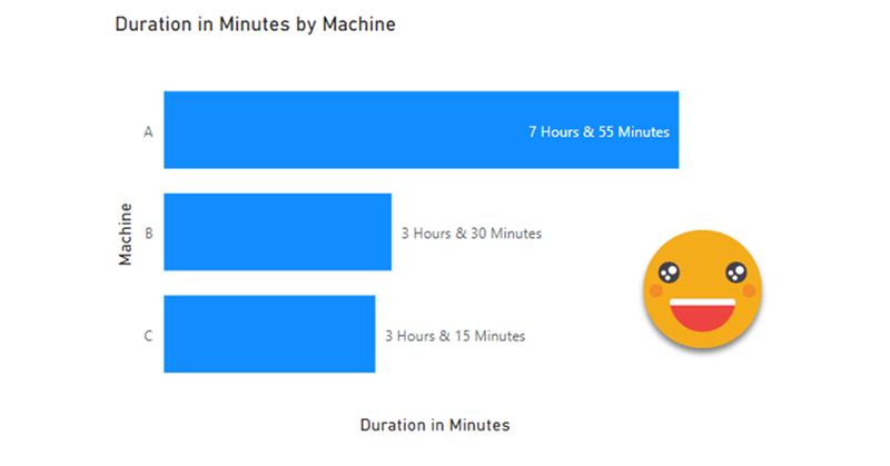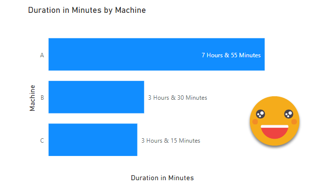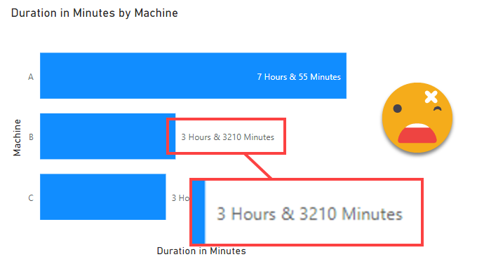 The use case itself is broad enough. We are measuring the duration of an event (working hours, machine runs, etc) and we want to visualize it. Since we want to compare things, we need to graph a number, however, as humans, we might like to see 4h 30min instead of 270 min. Searching around in google you will find several approaches for transforming a number of minutes or seconds into higher units of time. And that’s a great starting point. For example here’s a great post by Reza Rad. Here we’ll just imagine we have minutes and we want hours and minutes.