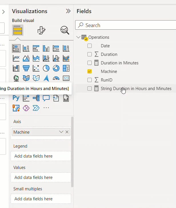 Let’s see if it works. We build a bar chart, use the [Duration in Minutes] In the values field, machine for axis and then we drag our calculation group column to the visual level filters, and activate the «Hours and Minutes» calculation item. Here’s what comes out