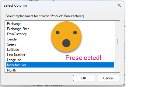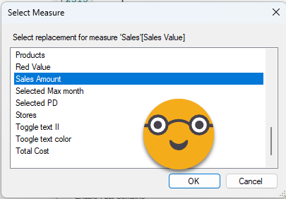 If the column or measure exists with the exact same name, it will be already preselected and if that suits you, you can click OK. (it’s a bit weird that TE2 does not show the table name of the column, in TE3 it works fine)