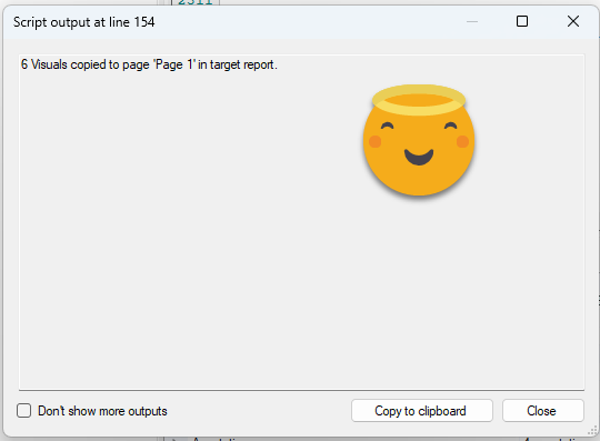 So what is to be done? Well I’ve come out with a new script that is not that different than the one on fixing broken fields. This time we’ll take a visual from one report, and we’ll add it to our target report. In the process it will confirm what field (column or measure) is to be used for all the fields that the visuals may have in any* place. (*no guarantees, but I try).