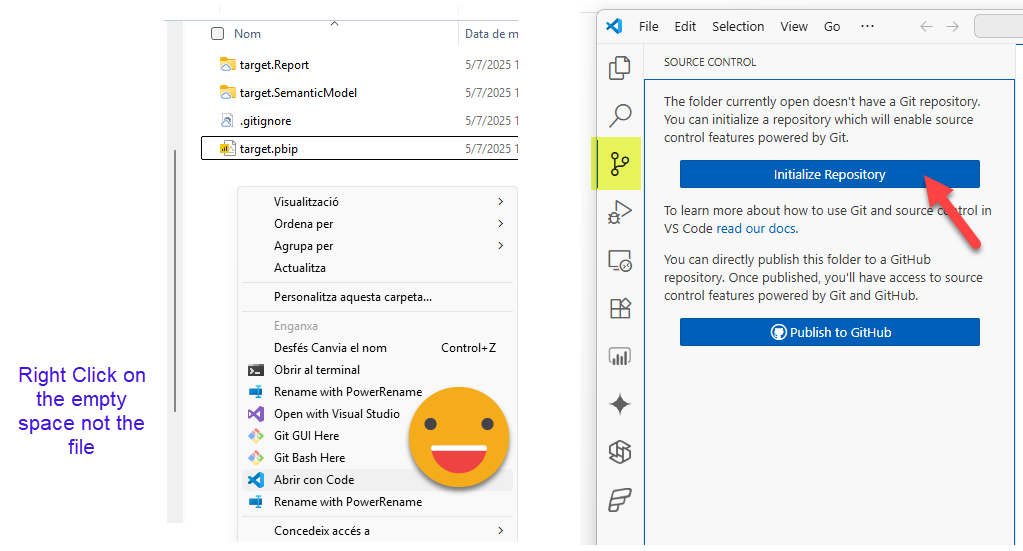 Then of course I saved it as well as a PBIP project with PBIR enabled. Right after that I initialized the repo on that same folder. After all that’s the whole point of the PBIP format, right? By the way, if you don’t have the options of «open in VS code» for files and folders, you are missing out (check out this page to get it)