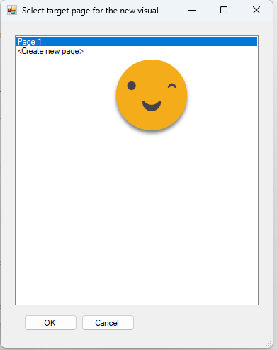 Once this selection has been made, we need to tell it the destination page for all the visuals. It can either be an existing page or a new one. In case you choose a new one it will recreate the first page of the report (without visuals) and then it will copy all the visuals there. For now we’ll select page 1.