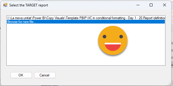 When you need to choose the target report you will see that the list now contains the template report path! Yes, it’s a «Recent PBIR files» list! As I was testing over and over report-layer scripts I introduced that little bit as a quality of life feature for myself. Just we aware that it reorders them rigorously, so the last one you clicked on will be the very top one the next time. It can hold up to 10 different paths.