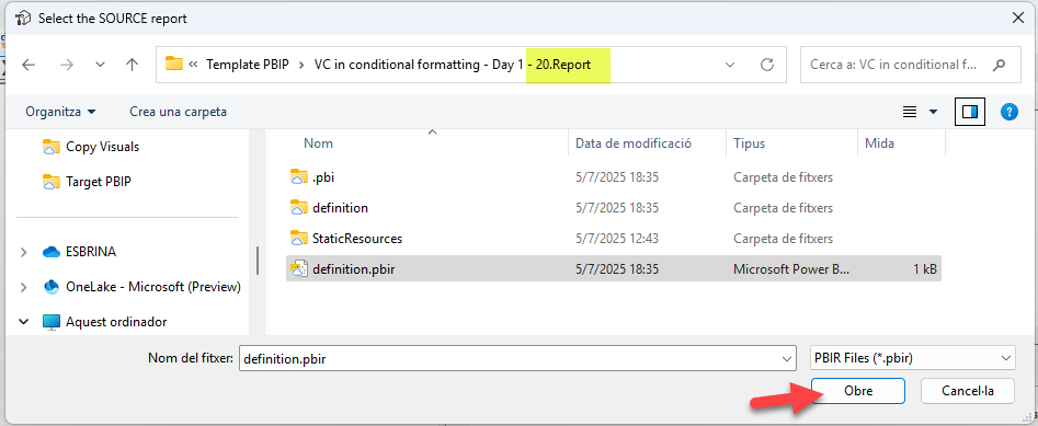 Click OK and you will need to find the PBIR file of your «Source» report, aka template report. The one that has the visuals you want to copy.