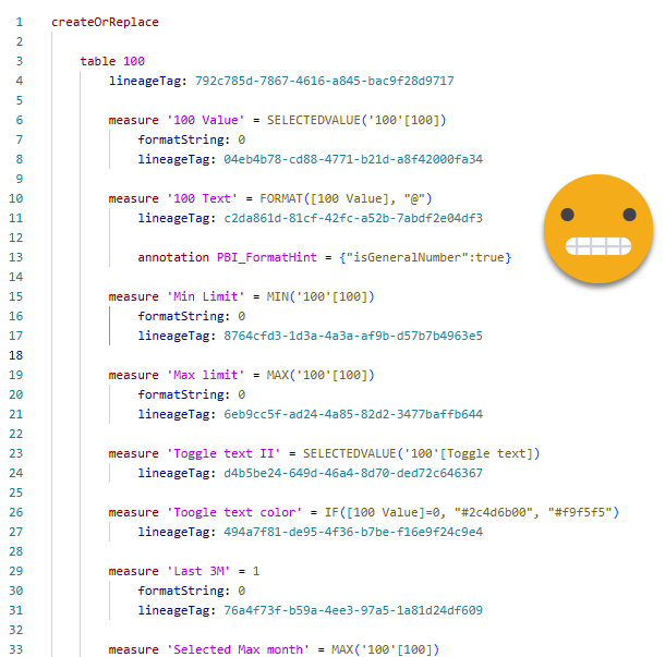 I looked at the model and looks quite a contoso model. Next I went to my blank report, also based on a slightly different contoso model. I realized that Erik’s model had quite a few numeric parameters and some field parameters, or even some extra tables like comments that where directly typed in power query. So using TMDL View I extracted all the code for those tables in Erik’s file and pasted it on mine. And it worked! Field parameters needed some adjusting after applying the code due to the different field names, but no big deal.