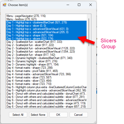 After selecting the target report, now a list of visuals shows up, including visual groups (last selected item). Let’s select all the visuals from page one, and see if it can reproduce them in the target report.
