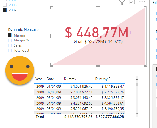 Now we save back to the model and set up the kpi card: [Dummy] as main measure, [Dummy 2] as target (for some reason called Trend in the visualization pane), I used date as «Trend Axis». Then I added the PY calc item at the visual level and added a filter by year to get some meaningful results. Oh and of course the Dynamic Measure slicer with the column from the Dynamic measure calc group.
