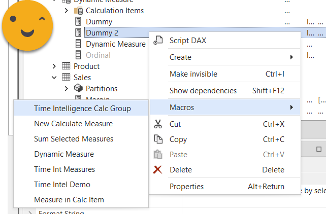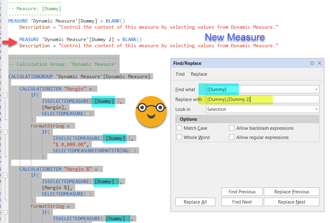 Well, even though you think you’ll be replacing just on the selection, it will replace on the whole script (there’s an open bug on this, so most likely will be fixed eventually) — just fix the code on the [Dummy] measure, or delete it altogether as we do not need to modify that part. Execute and we should be ready to go. If you are in Tabular Editor 2 add the measure and just modify manually each calculation item (value and format string expression)