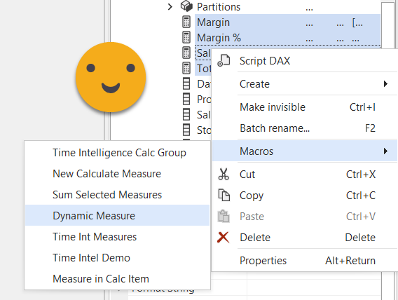 First of all, we’ll get our good old Contoso model and create a dynamic measure calc group with our usual 4 measures. (you can get the script of the macro and learn how to use it in this blog post)