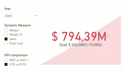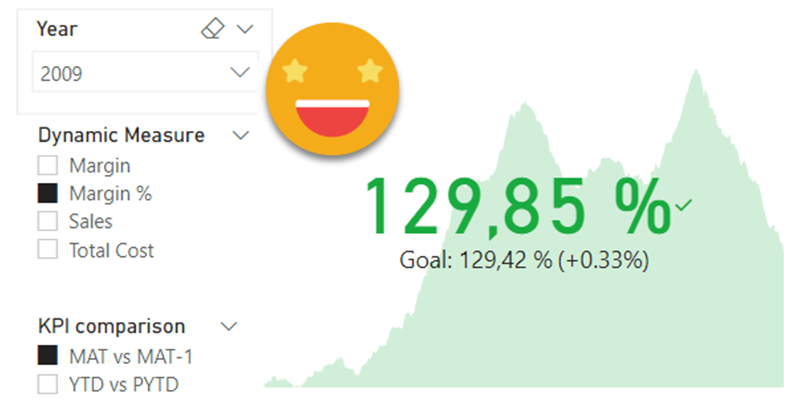 I know, it looks like it does not really work because the big number does not change when I change the KPI comparison Calc Item, but it’s OK — the reason is that I only filter by year so the latest value (which is what is displayed) is adding exactly the same rows for both YTD and MAT, exactly from Jan 1st to December 31st.