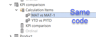 Here calcItem gets the name of the active calc item, then I just protect it a bit so that it does not break with a wrong name, and just extract both calc item names. I’m not checking that these names exist not to complicate things further, but you could do it if you wanted to — calc item names are values in a column after all. Here what is nice is that I don’t explicitly use either YTD or PYTD so I can just duplicate the calc item and with the name of the calc item define which two calc items should be used for comparison.