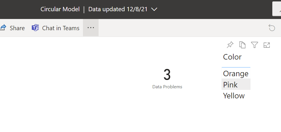 Now we’ll publish the dataset and refresh it so that the mapping will be included in the dataset from which the excel file reads. Depending on your setup you’ll need to put your credentials on the different data sources as usual before you can refresh from the service. But once it works, you’ll see that the report shows there are 3 data problems! Orange, Pink and Yellow are not mapped (for details on how to set up such a «data problems» sheet check out the post I mentioned at the beginning)