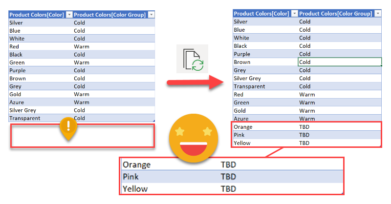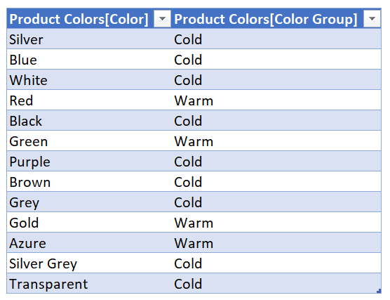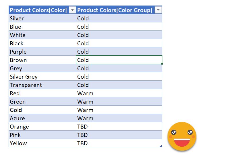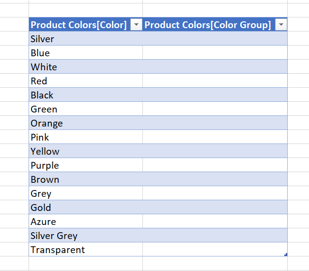 Let’s go step by step. First of all we’ll create a column, either with DAX or Power Query as if it all was nice and done. Following the example of the previous installment, we’ll imagine we have a table with all colors, and a color group column, by default blank. The crucial part is that the color column comes from the source data, so that if new colors appear they will be in this table too.