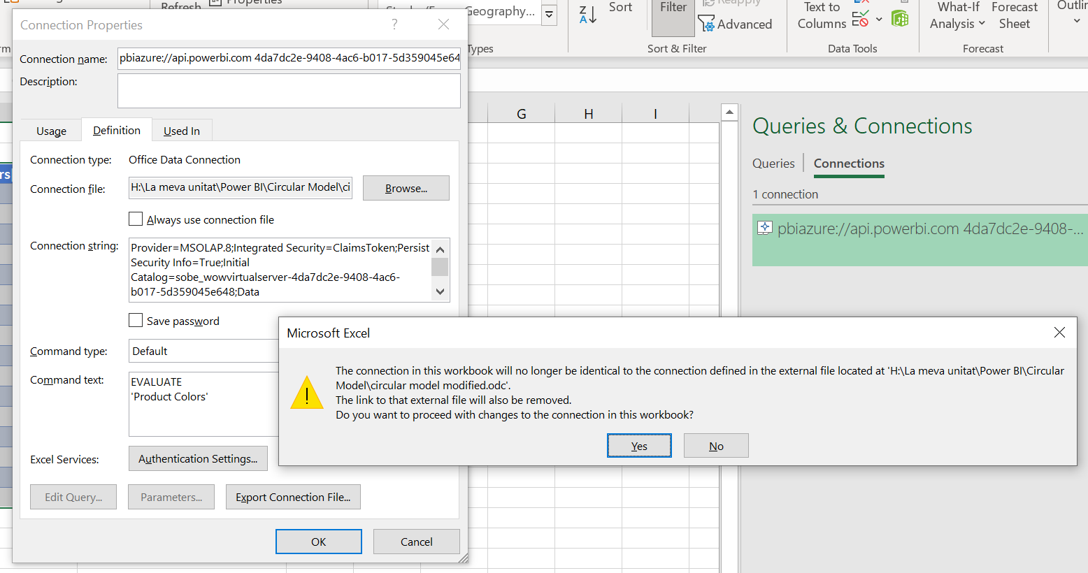 We’re getting now on the techiest part of it. We open the excel file (enable editing, enable data connections), go to connections & queries, select the only connection there is and click export. It will save the connection file in your hard drive. Save it wherever you like and open it with a text editor such as notepad or notepad++.