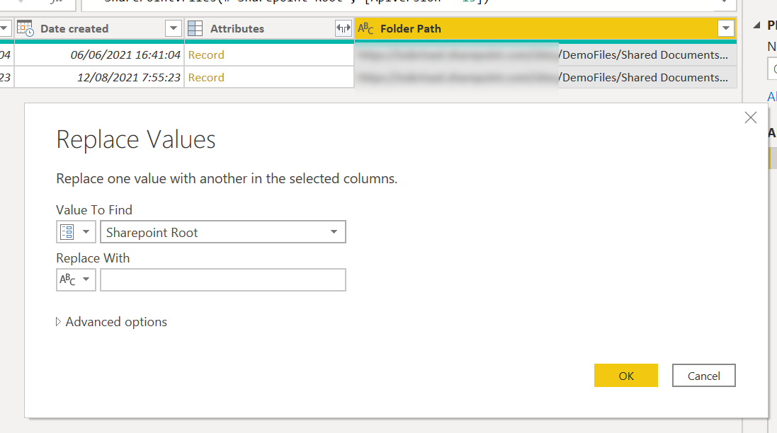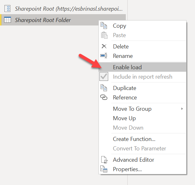 So we have this beautiful view with just the relative path to each of the files in the sharepoint site. If we ever have to move the sharepoint site to another address we just need to change the parameter value. Also, since this query at this point might come in handy later if we need to get another file form the same sharepoint file, we’ll call it «SharePoint Root Folder» or something like that and we’ll disable loading.