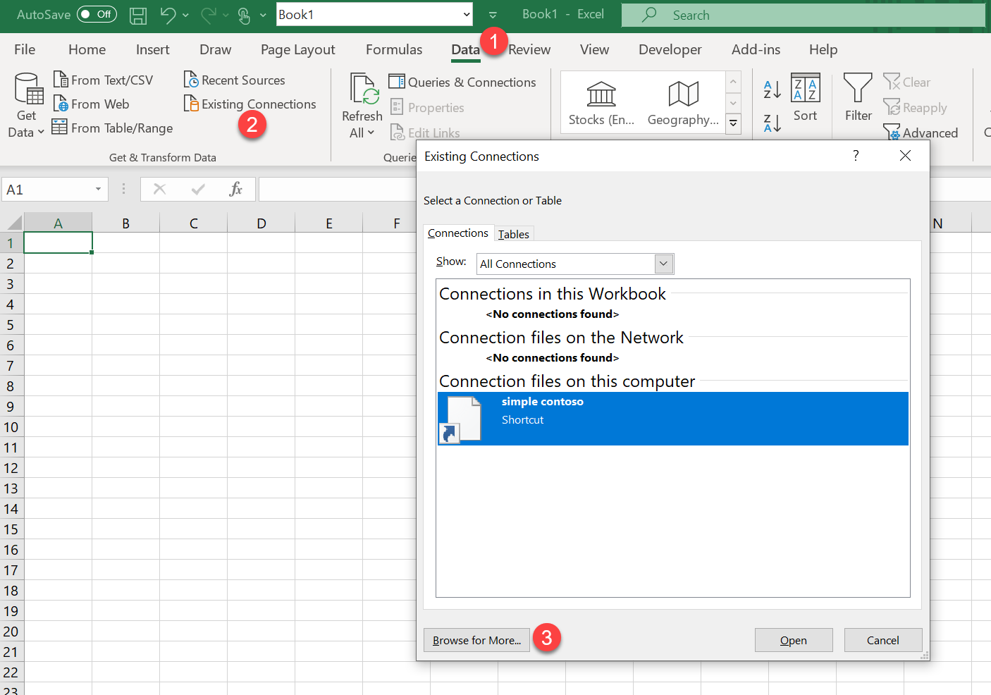 Now open a new excel file, go to data (1), existing connections (2), browse for more (3)