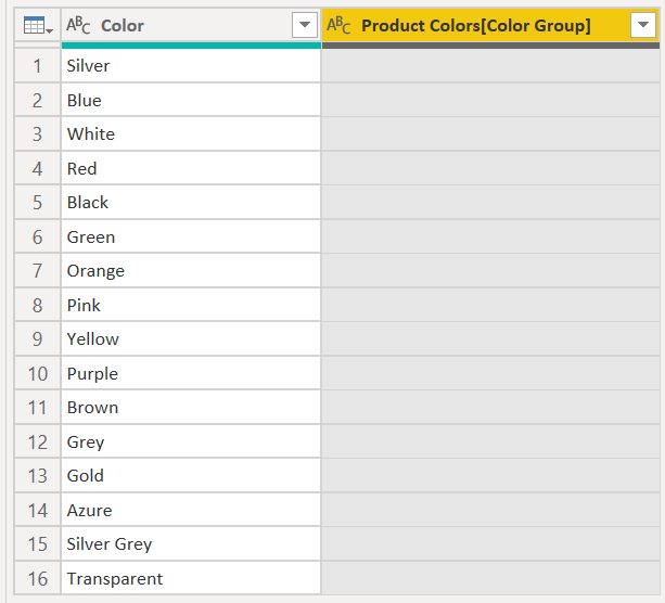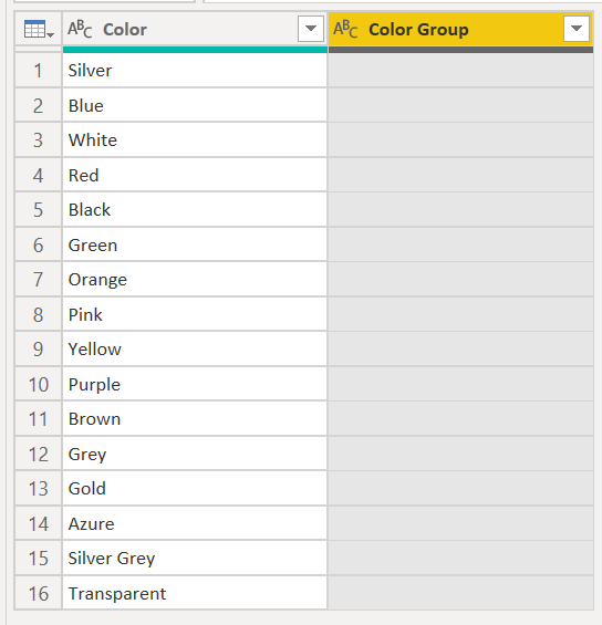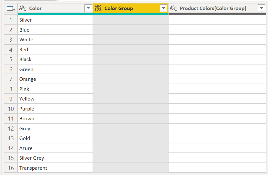 let Source = Product, #"Removed Other Columns" = Table.SelectColumns(Source, {"Color"}), #"Removed Duplicates" = Table.Distinct(#"Removed Other Columns"), #"Added Custom" = Table.AddColumn(#"Removed Duplicates", "Color Group", each "") in #"Added Custom"