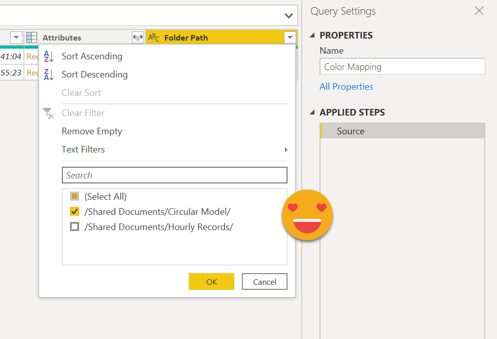 let Source = #"Sharepoint Root Folder", #"Filtered Rows" = Table.SelectRows( Source, each ([Folder Path] = "/Shared Documents/Circular Model/") ), #"Filtered Rows2" = Table.SelectRows( #"Filtered Rows", each [Name] = "Circular Model color Input.xlsx" ), Content = #"Filtered Rows2"{0}[Content], #"Imported Excel Workbook" = Excel.Workbook(Content), #"Filtered Rows1" = Table.SelectRows(#"Imported Excel Workbook", each ([Kind] = "Table")), ColorMapping_Table = #"Filtered Rows1"{[Item = "ColorMapping", Kind = "Table"]}[Data] in ColorMapping_Table