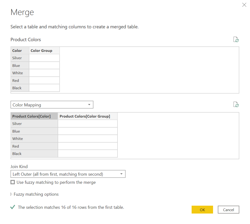 And we’ll just replace the existing «Color Group» column, with the column coming from the ColorMapping table, which we’ll rename to «Color group» at the end:
